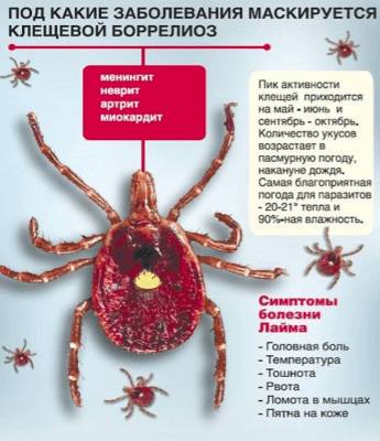 Так как на территории России в основном в качестве переносчиков в весенний период являются клещи, распространены 2 основных типа заболеваний, которые они могут вызвать: энцефалит и болезнь Лайма (он же боррелиоз). Первая носит вирусный характер, вторая основана на болезнетворном воздействии бактерии боррелия. Если энцефалит проявляется достаточно быстро, то болезнь Лайма может отложить своё возникновение на 7 лет.