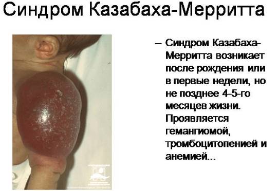 Синдром Казабаха – Мерритта – это сосудистая опухоль, которая называется гемангиома, и расположена зачастую под кожными покровами или на внутренних органах. Кроме того, этот недуг сопровождается значительным снижением тромбоцитов и анемией (сниженным количеством эритроцитов и гемоглобина). В результате тромбоцитопении страдает процесс свертывания крови, возникают спонтанные кровотечения наружного характера, или же внутреннего – мозговые, кишечные и др. Заболеванию подвержены чаще всего дети грудного возраста и новорожденные.
