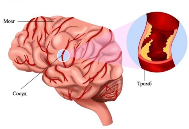 Тромбы могут возникать не только непосредственно в сосудах мозга, но и попадать туда из сосудов других органов, когда ток крови переносит тромб в мозг. В таком случае такой тромб или его фрагмент называют эмболом, а состояние закупорки сосуда — тромбоэмболией. Оторвавшийся тромб может мигрировать с кровотоком в мозг, закупорить сосуд и прекратить кровоснабжение участка мозга, вследствие чего ткань начинает испытывать гипоксию (нехватку кислорода). Хроническая ишемия клеток проявляется нарушением функций, регулируемых данным участком мозга. Если тромб не будет своевременно устранен, возникает последующий ишемический некроз этих клеток и полная утрата функции, вплоть до летального исхода.